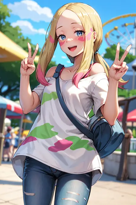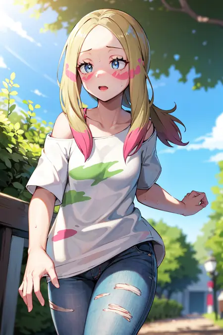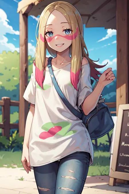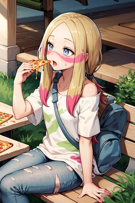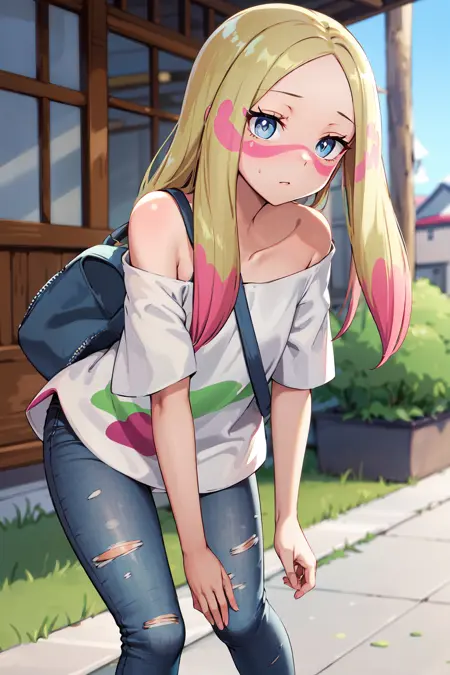 衣服1abcmina, 長い髪, 睫毛, 半閉じた目, 顔のペイント, 鎖骨, 白いシャツ, 大きめのシャツ, 肩出し, 短い袖, 破れた服, 破れたズボン, ジーンズ, ショルダーバッグ
