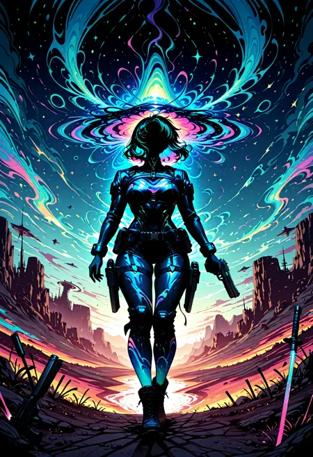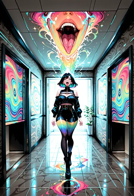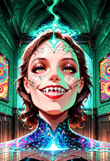 サイケデリックなパレット: ネオンカラー、輝くグラデーション、眩いコントラストでシーンを満たします。