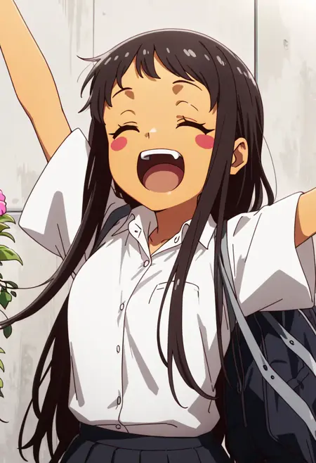Hina Kyan - zzHinaKyan, 1girl, solo, blue eyes, long hair, black hair, dark skin, dark-skinned female, blush stickers,,, skirt, shirt, uniform, white shirt, short sleeves, pleated skirt, collared shirt, black skirt, shirt tucked in,