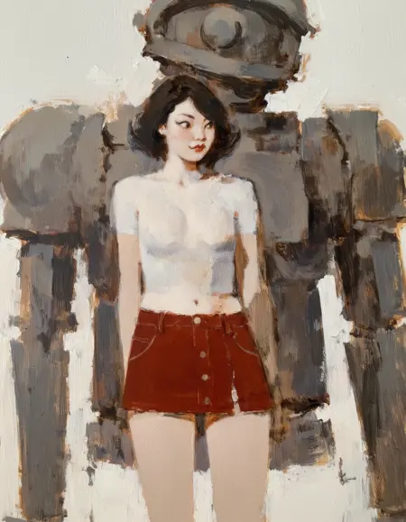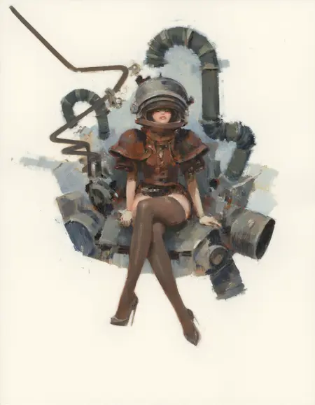 フューチャリスティックなスーツと大きなヘルメット、ジェットパックを身に着け、ピンクの太ももまで届くブーツとマッチするスカートを着た女性が、柔らかいベージュの背景に抽象的な筆致を施し、スーツと装備は控えめなレッドとブラウンで構成され、アッシュリー・ウッド風に背景と調和したオイル絵画