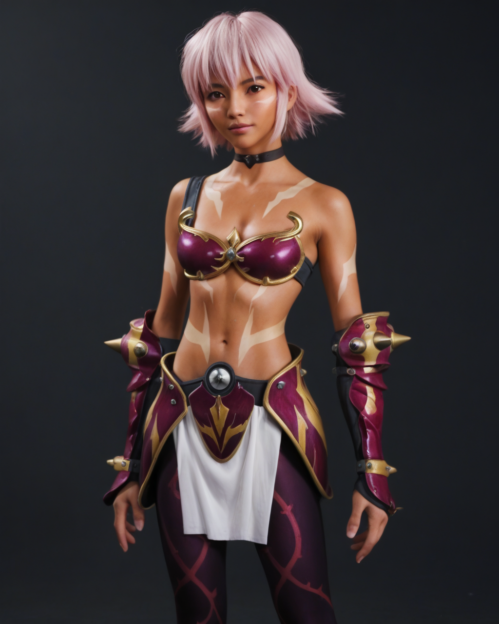 bl4ckr0se, 1girl, solo, 분홍색 머리, 단발, 붉은 눈, 검은 피부 여성, 금색 피부 페인트, 금색 전쟁 안면 칠, 초커, 단일 스트랩이 있는 부르고뉴색 비키니 아머 상의, 부르고뉴색 허리 아머, 흰색 골반 커튼, 보라색 스타킹에 붉은 덩굴무늬, 흰색 부츠, 날카로운 팔꿈치가 있는 부르고뉴색 팔 보호대