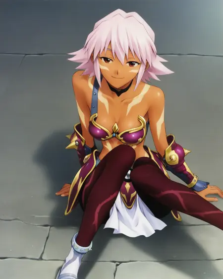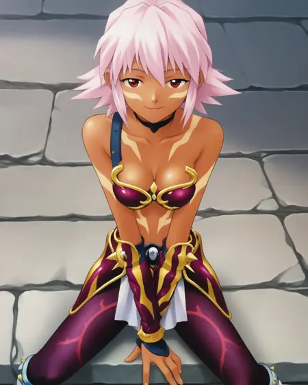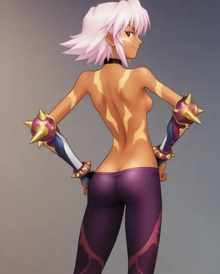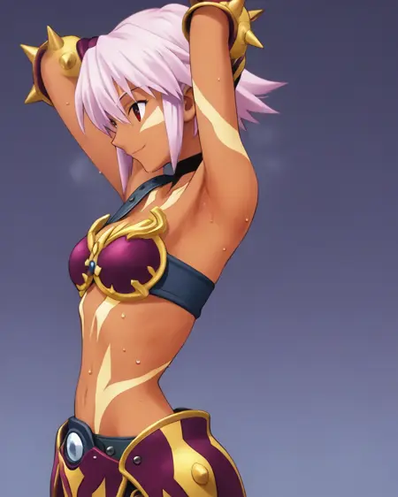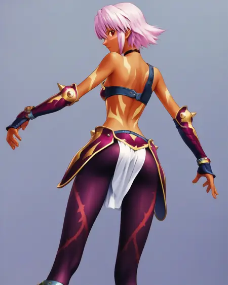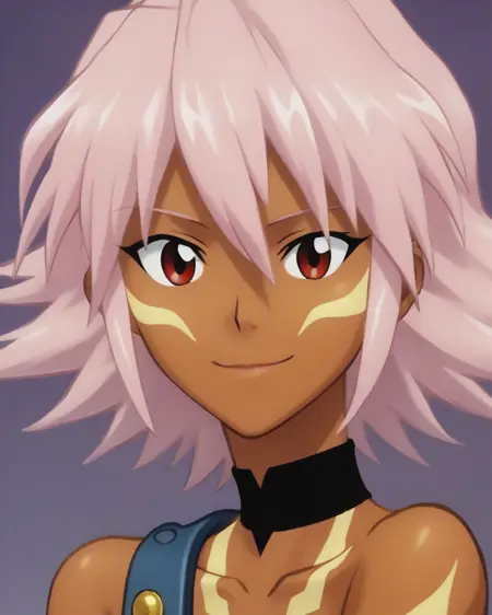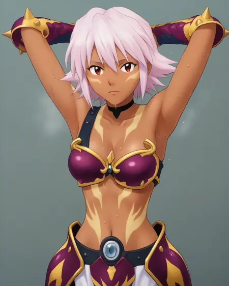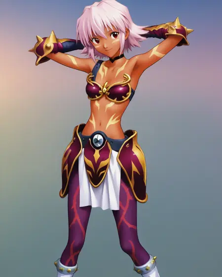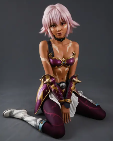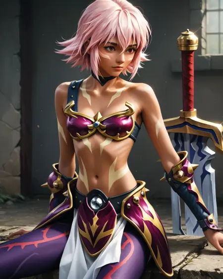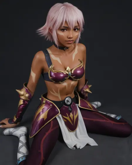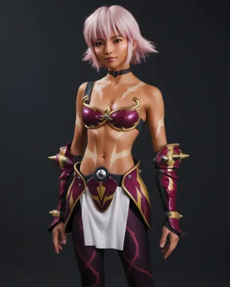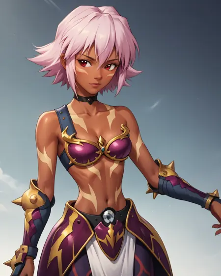 bl4ckr0se, 1girl, solo, pink hair, short hair, red eyes, dark skinned female, gold skin paint, gold warpaint, choker, burgundy bikini armor top with single strap, burgundy waist armor, white pelvic curtain, purple tights with red vines, white boots, burgundy bracers with spiked elbows
