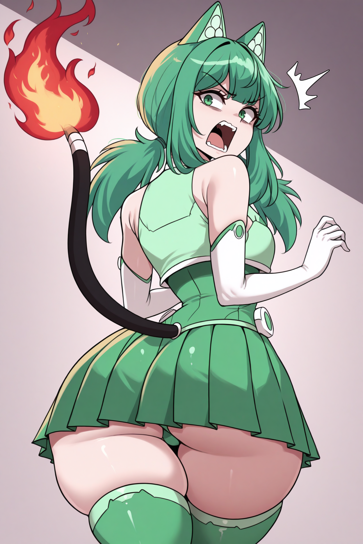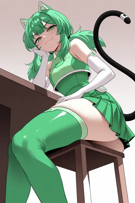 彼女の典型的な外見には、「緑のレオタード、ツートーンレオタード、肘まで手袋、白い手袋、緑のミニスカート、プリーツスカート、緑のタイツ、尾」を追加してください。