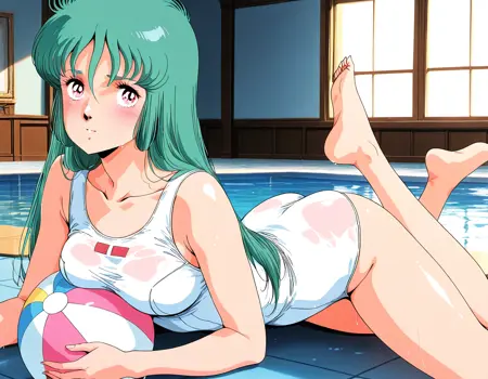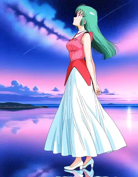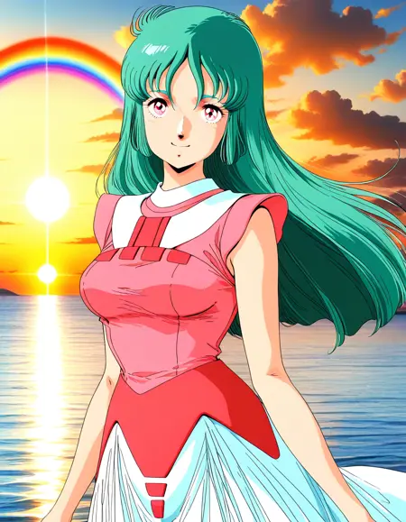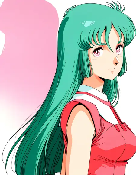 Ciela_Lapana, 1girl, solo, long hair, pink eyes, aqua hair, bangs, medium breasts, 1980s (style),