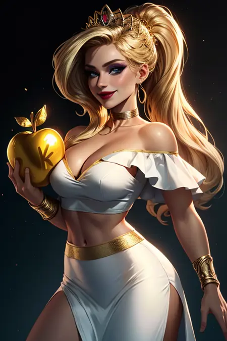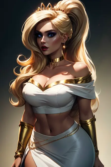gold choker, silver tiara ,white skirt, cleavage, midriff, off shoulder, gold bands,