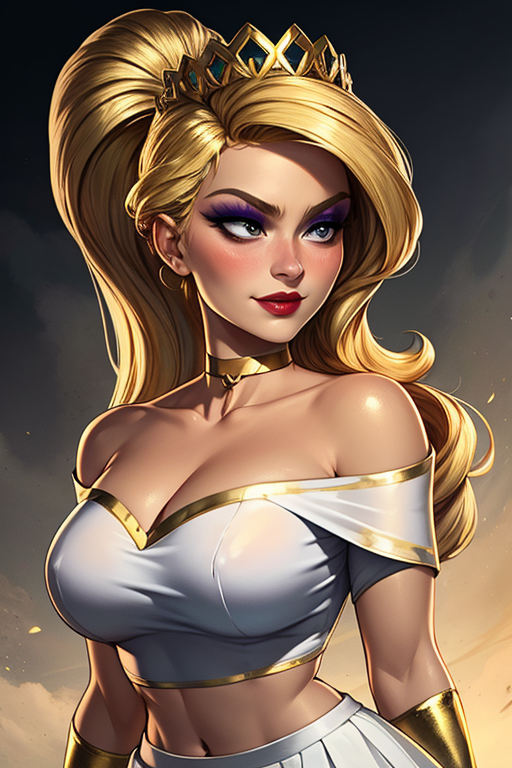 金色项圈,银色王冠,白色裙子,乳沟,露腹,露肩,金色手环,
