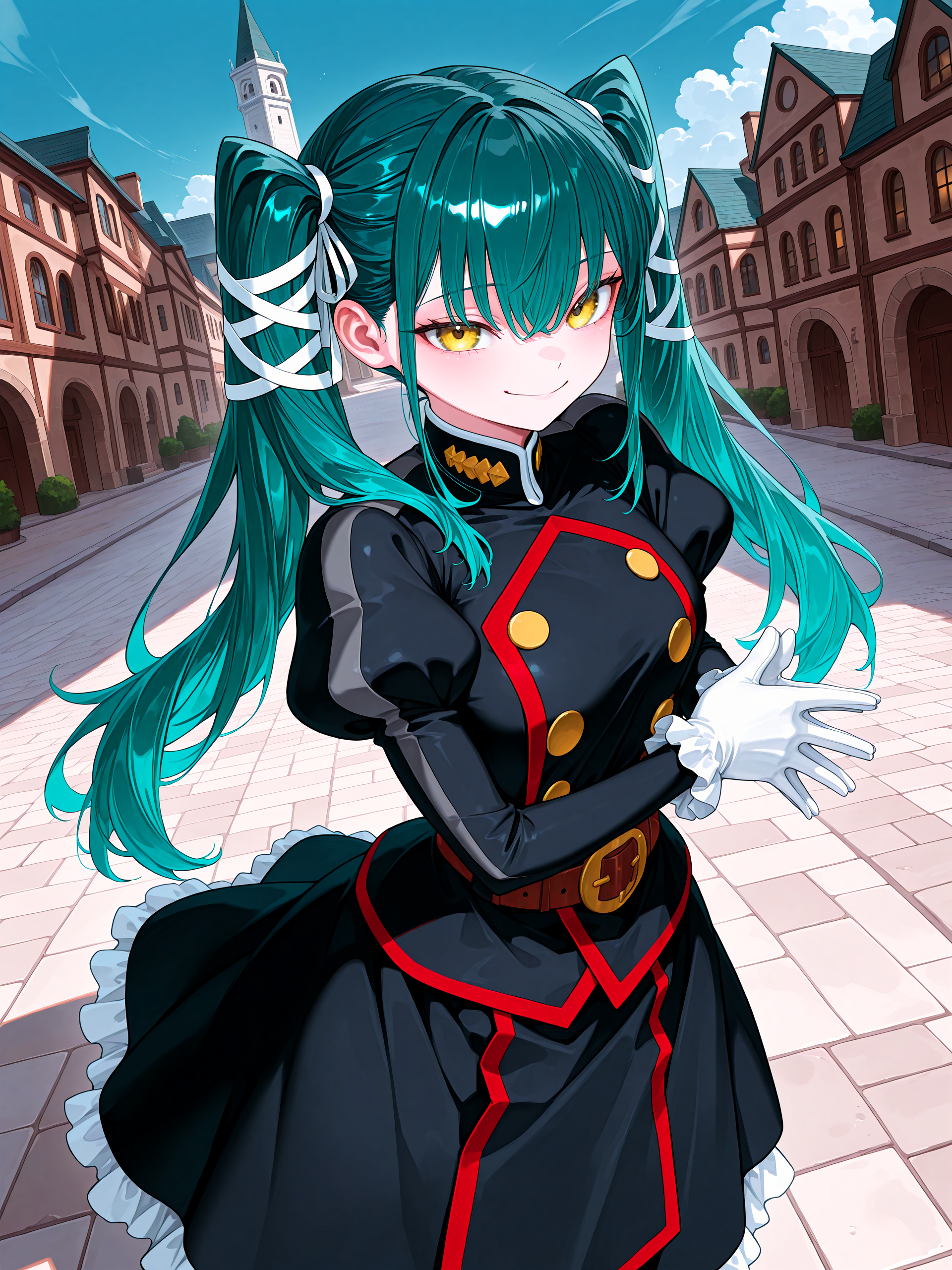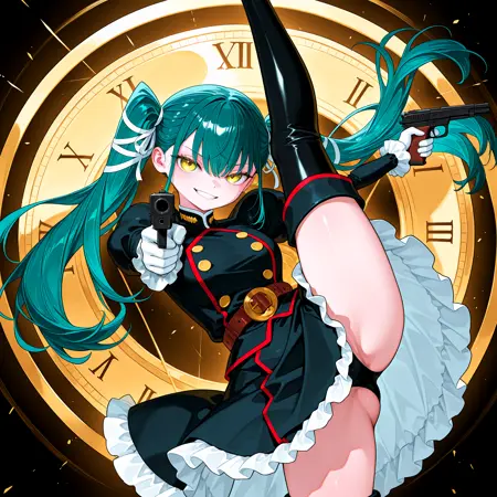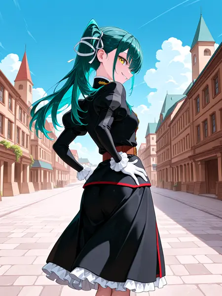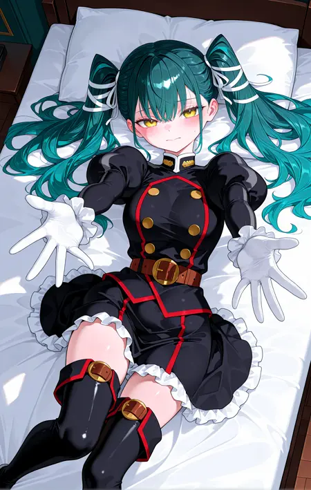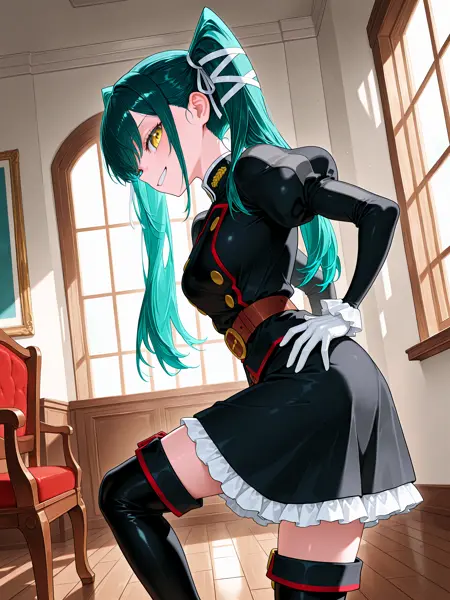 • 黒い服、軍服、ふくらはぎ袖、フリル付き袖、白い手袋、茶色のベルト、長いフリルスカート、太ももブーツ