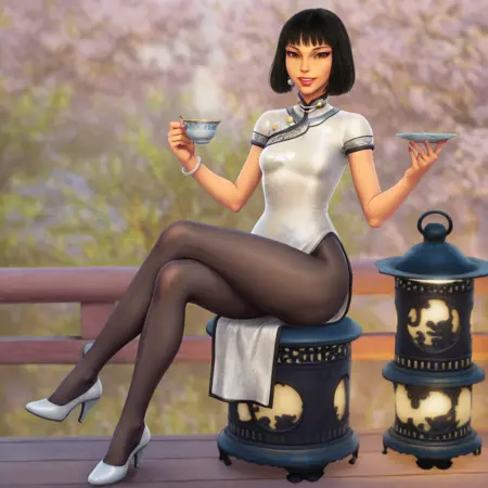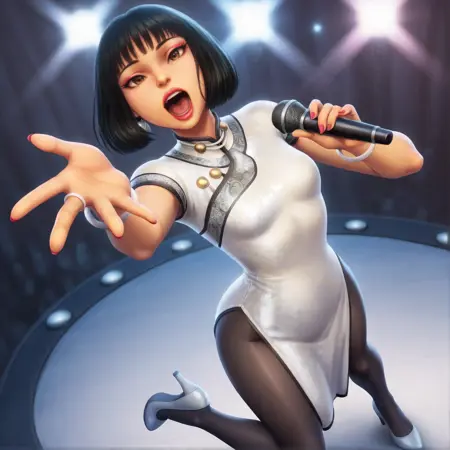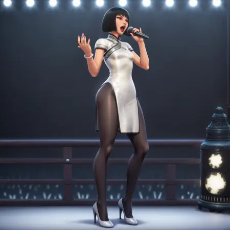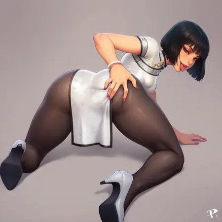 P_Yuki, bob cut, black hair, brown eyes, small breasts, wide hips, makeup, lips, white china dress, buttons, black pantyhose, high heels, white bracelet,