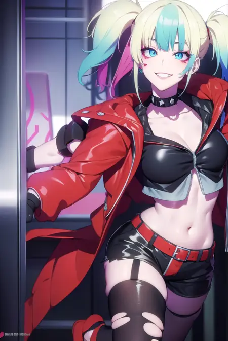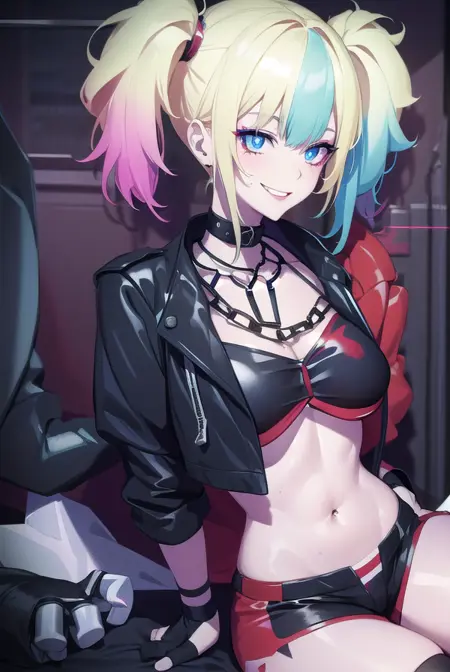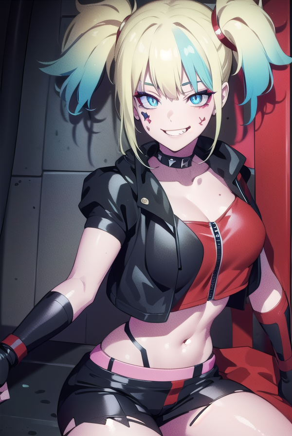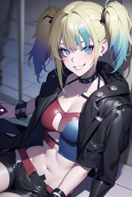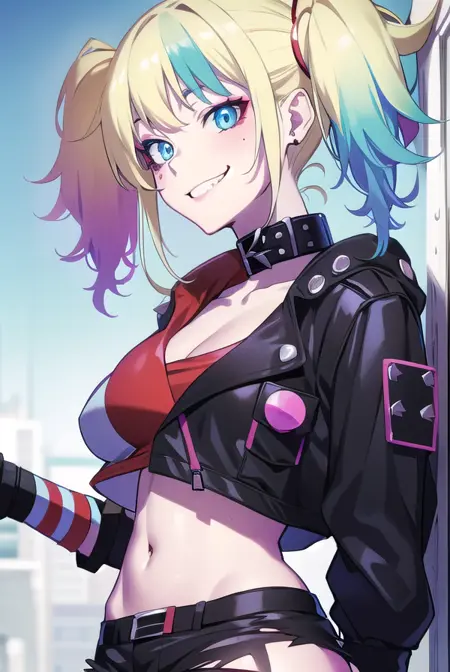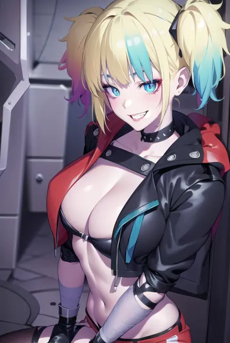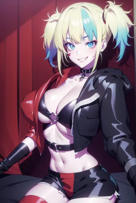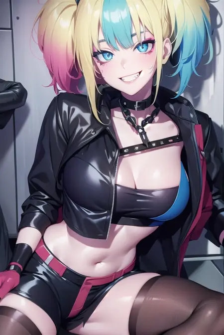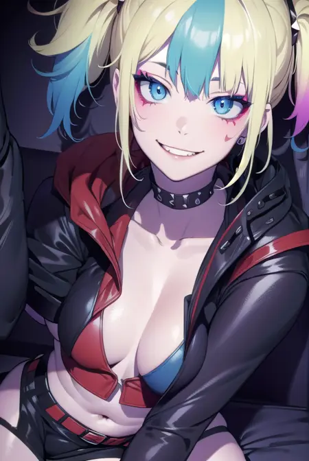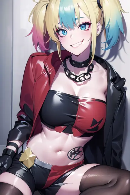 harley quinn,刘海,蓝眼睛,金发,双马尾,蓝发,多色头发,项圈,渐变发色,妆容,穿孔,粉发,嘴唇,口红,红唇,