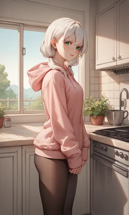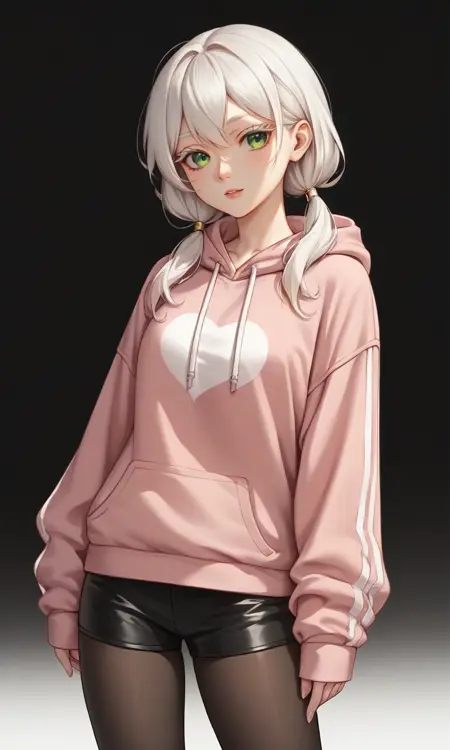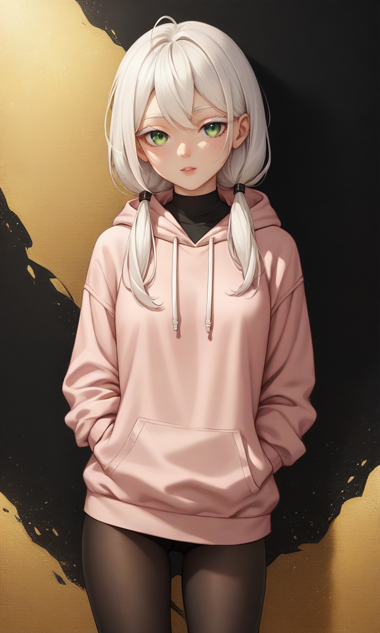 1girl, blunt bangs, low twintails, white hair, medium hair, green eyes, white lashes, pink lips, long sleeves, pink hoodie, black pantyhose