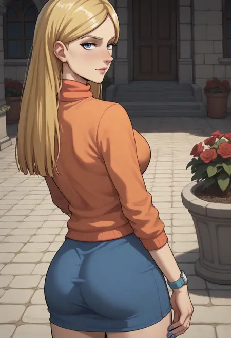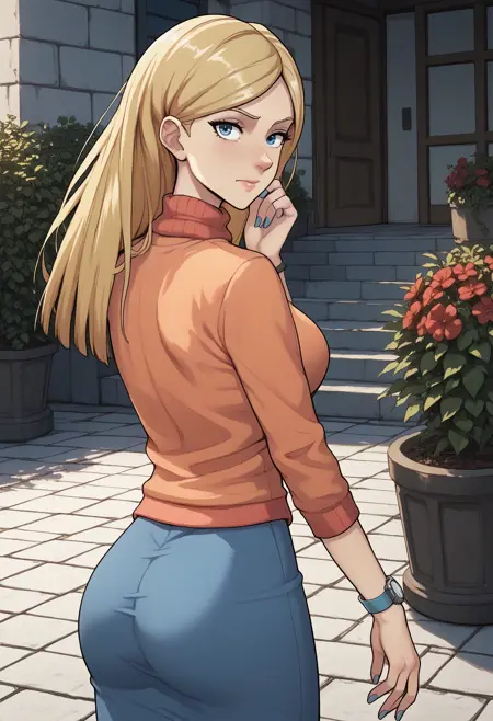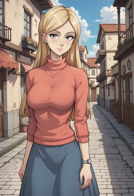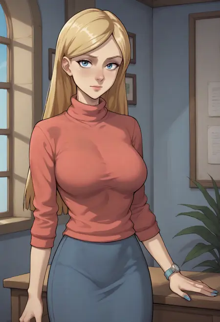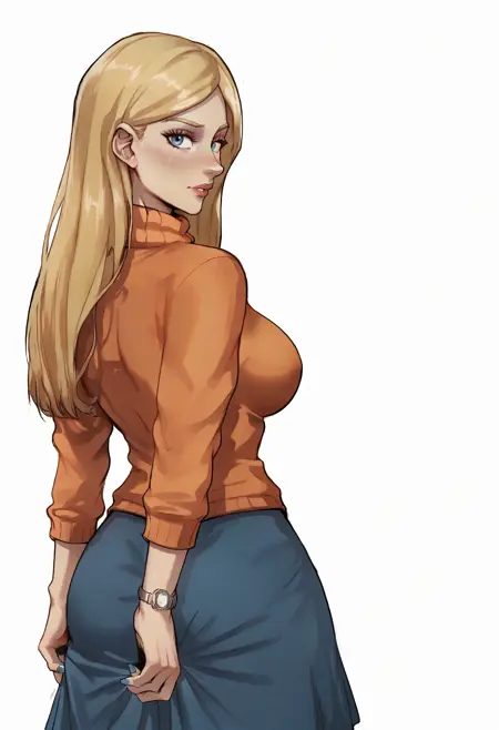 recommended tags: 1girl, blue eyes, blonde hair, long hair, breasts, large breasts, sweater, turtleneck, skirt, blue skirt, nail polish, blue nails, watch, wristwatch,