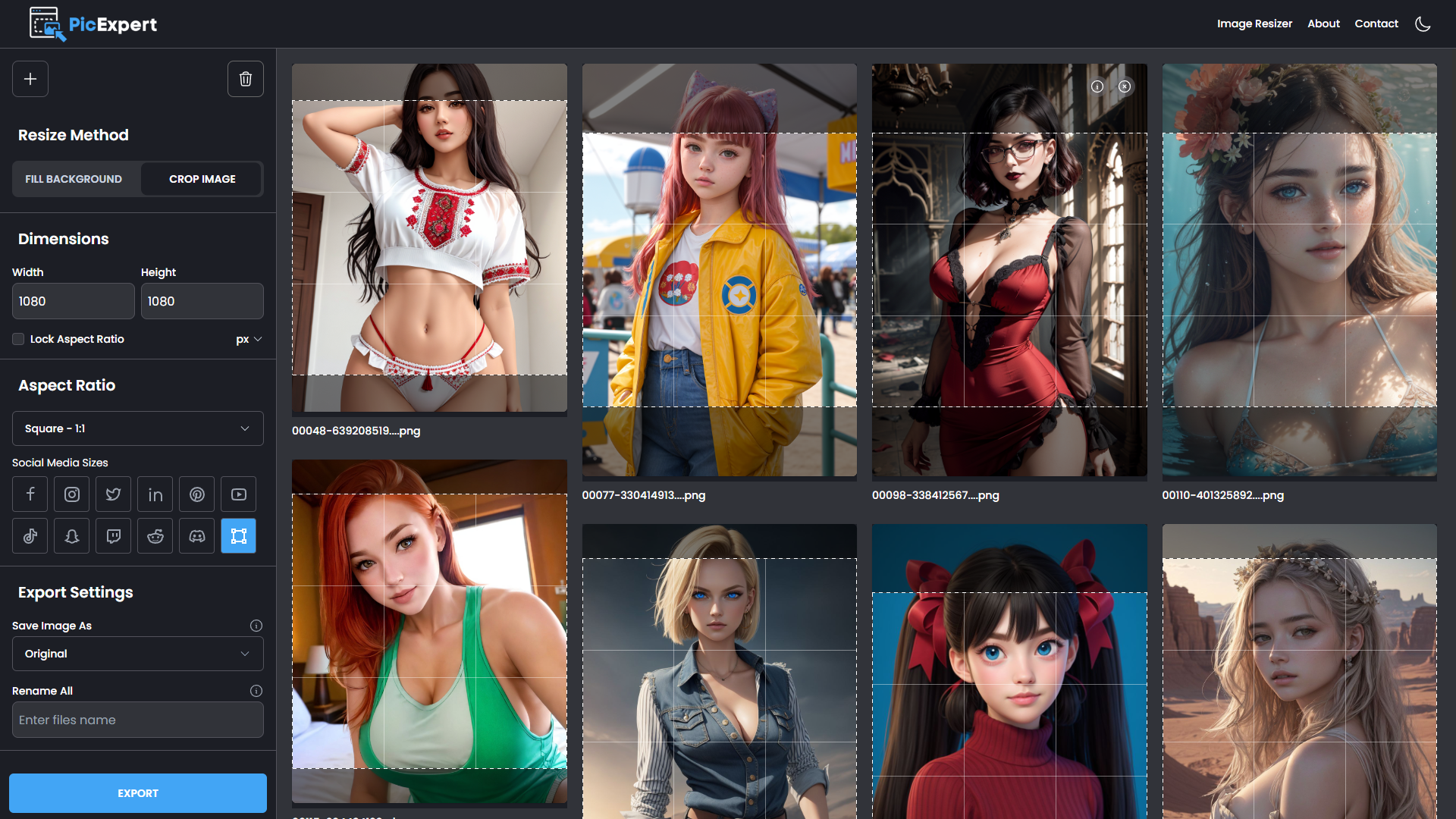 PicExpert.net 是您轻松调整和裁剪多张图片的首选在线工具。凭借我们简洁友好的用户界面设计,实现完美的图片尺寸和宽高比从未如此简单。最重要的是,完全免费使用,无需安装、注册或添加水印!