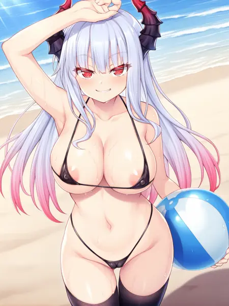 tag: Arccco, (white hair), red ascot, red eyes, v-shaped eyebrows, hair between eyes, bangs, ((((dragon horns, horns)))), long hair, gradient hair, multicolor hair,