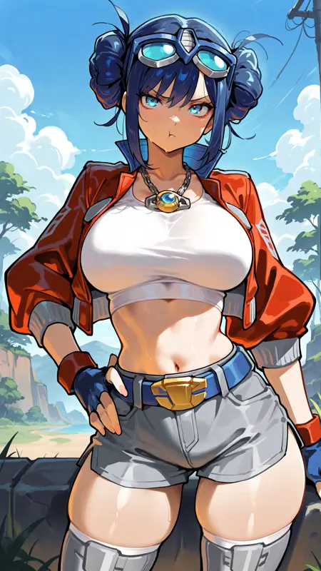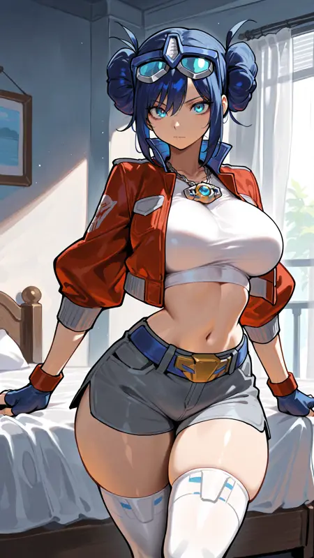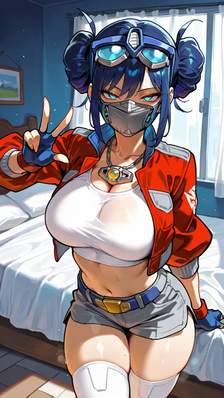 1girl, solo, WifetimusPrime, 青髪, ダブルバント, 頭に眼鏡, ネックレス, 白いカットソー, 赤いカーディガン, フィンガーレスグローブ, グレーのショートパンツ, バンズ, ブーツ, (フェイスガード用マスク)