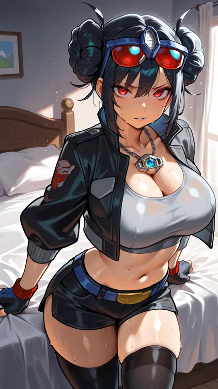 1girl, solo, WifetimusPrime, red eyes, black hair, double bun, red eyewear on head, black frame eyewear, necklace, grey crop top, black jacket, cropped jacket, black gloves, fingerless gloves, black shorts, black thighhighs
