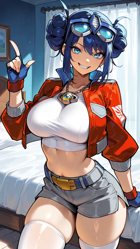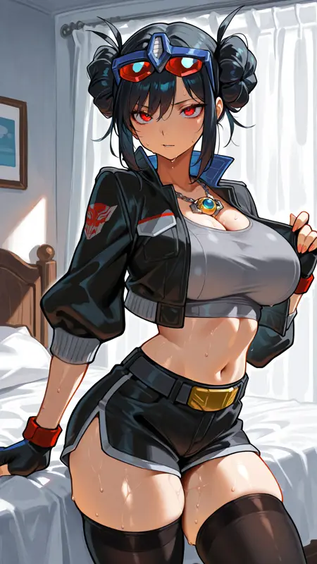 トレーニング画像には含まれていませんでしたが、色を変えるだけで十分なネメシスプライムを作成できます: 1girl, solo, WifetimusPrime, 赤い目, 黒髪, ダブルバント, 赤い眼鏡(頭に)、黒フレームの眼鏡, ネックレス, グレーのカットソー, 黒いジャケット, カーディガン, 黒い手袋, フィンガーレスグローブ, 黒いショートパンツ, 黒いバンズ