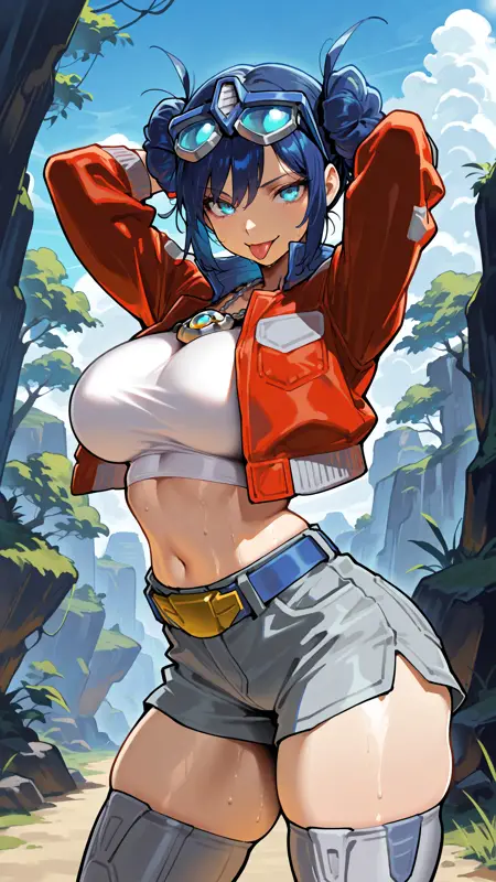 1girl, solo, WifetimusPrime, blue hair, double bun, eyewear on head, necklace, white crop top, red cropped jacket, fingerless gloves, grey shorts, thighhighs, boots, (mouth mask for the faceguard)