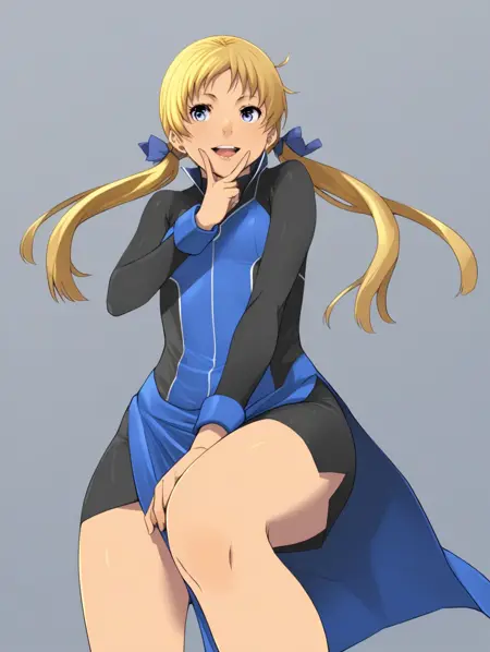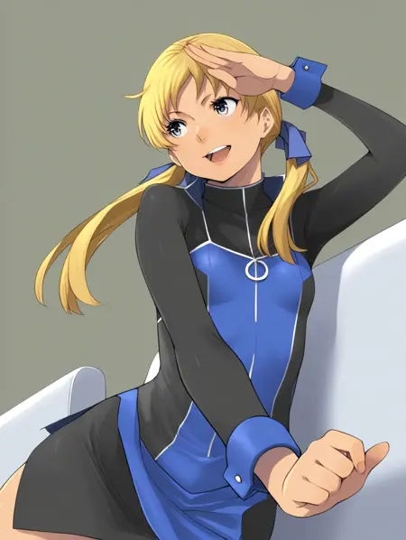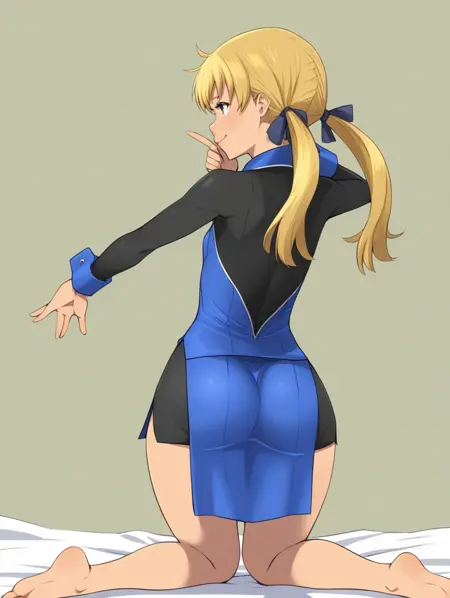 prompt example :SO1weruti,blonde hair,low twintails,black dress,blue dress,long sleeves,hair ribbon,blue wrist cuffs,pencil skirt,pelvic curtain,