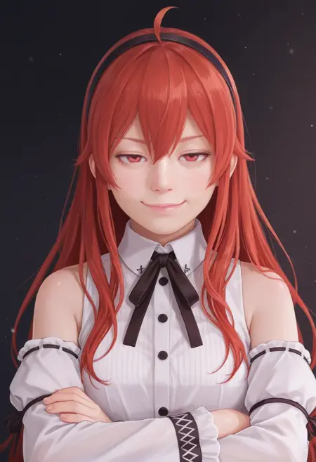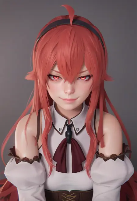 eris, realistic, red eyes, red hair, hairband, ahoge, long hair, hair between eyes, white shirt, detached sleeves, brown shorts,