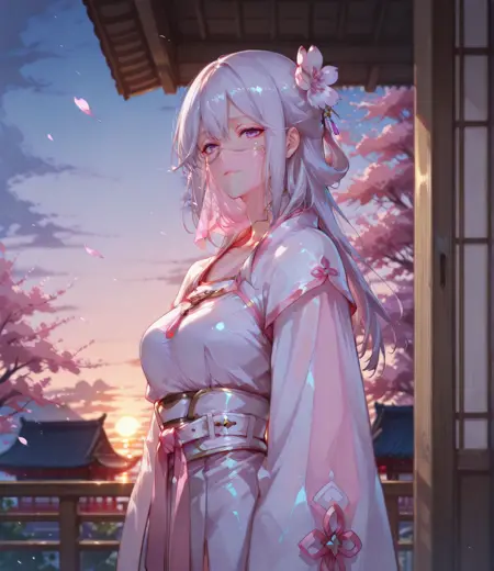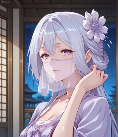 chuquingcheng, hair between eyes, silver hair, light lilac hair, white hair flower, hair ornament, purple eyes, medium breasts, (half-updo), bangs backwards, half-lose hair,
