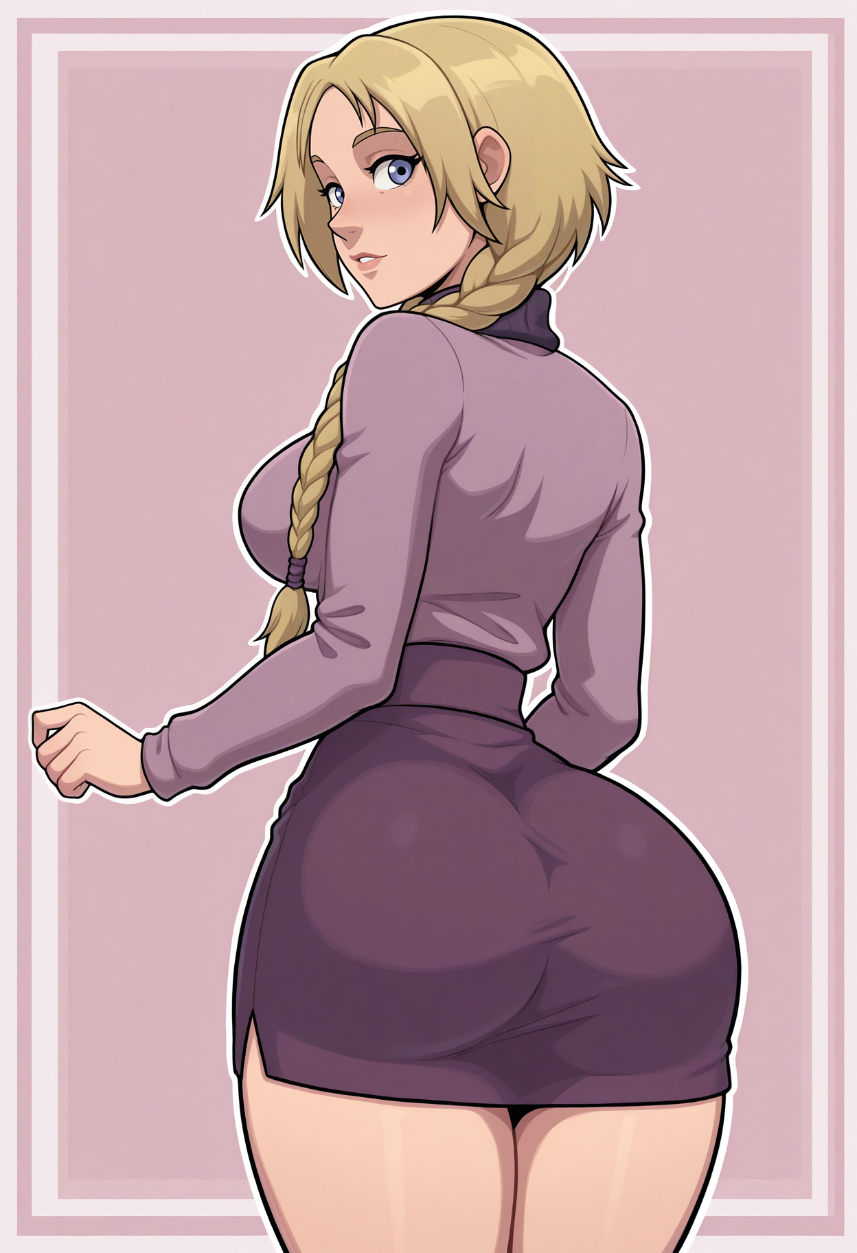 推奨タグ:1girl, solo, 青い目, 金髪, 長髪, 編み上げ, 肩にかかる髪, 二本編み, 中程度の胸, セーター, 長袖, ハイネック, スカート, 紫のスカート, ブーツ, ヒザ上ブーツ, 紫色の靴