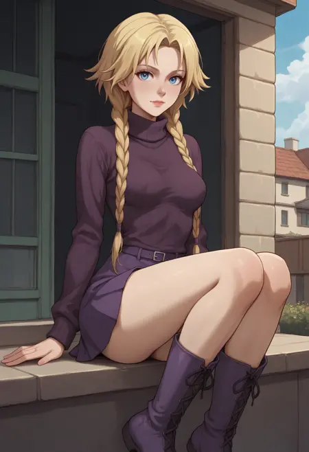 권장 태그: 1girl, solo, 파란 눈, 금발, 긴 머리, 땋은 머리, 어깨 위 머리카락, 쌍 땋은 머리, 중간 크기 가슴, 스웨터, 긴 소매, 터틀넥, 치마, 보라색 치마, 부츠, 무릎 부츠, 보라색 신발,