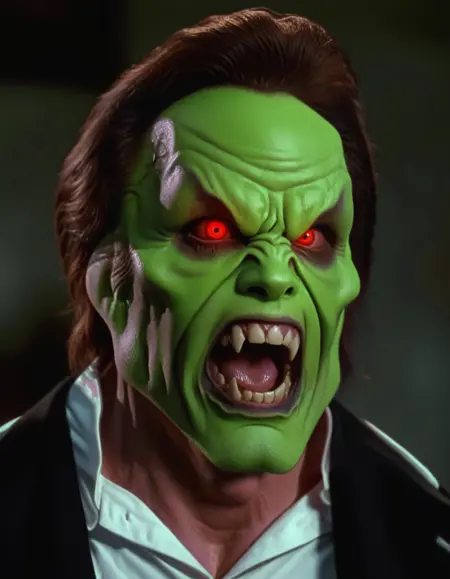 "the_mask, man with a green monster face, slicked-back brown hair, cinematic lighting, evil aura"