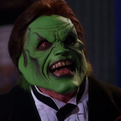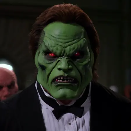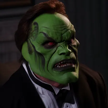 "the_mask, man with a green monster face, slicked-back brown hair, cinematic lighting, evil aura"