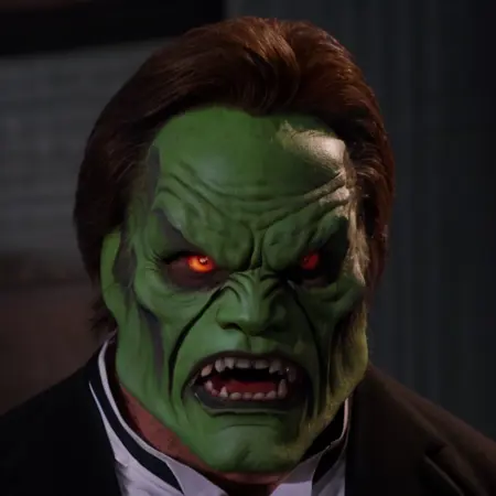 "green-faced villain with sharp brown hair, sinister smile, glowing eyes, intimidating pose, dark background"