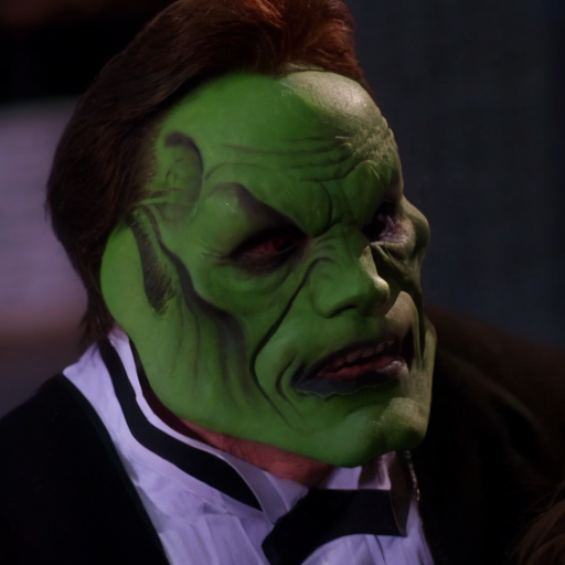 "man with a green head, a monstrous face, sharp brown hair, wearing a black suit, dramatic lighting, highly detailed"