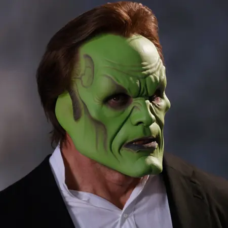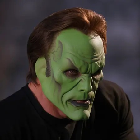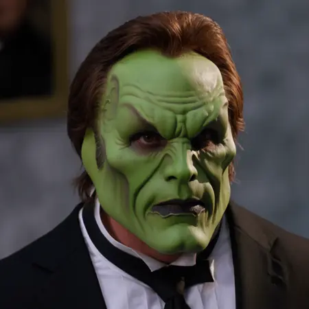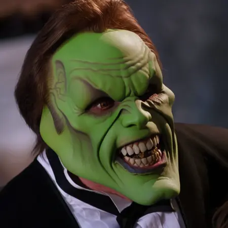 "the_mask, man with a green monster face, slicked-back brown hair, cinematic lighting, evil aura"