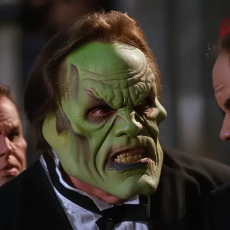 "the_mask, man with a green monster face, slicked-back brown hair, cinematic lighting, evil aura"
