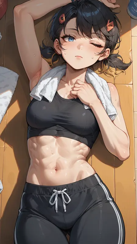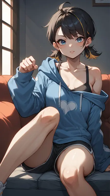 black hair, short twintails, multicolored hair, streaked hair, blue eyes, grey bodysuit, multicolored bodysuit, black and white bodysuit,