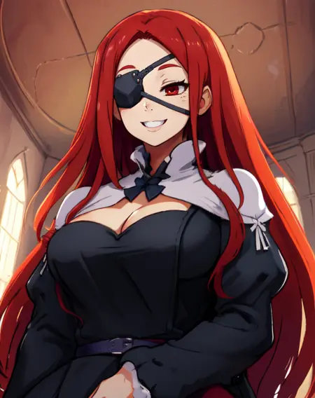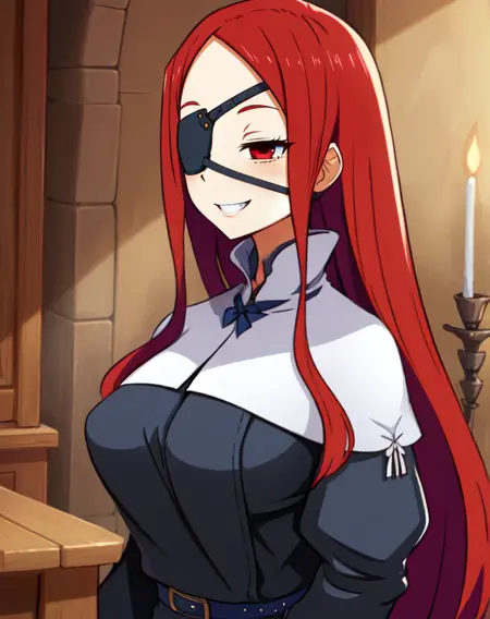 マリエッタ、右目パッチ、長い赤髪、赤い目、