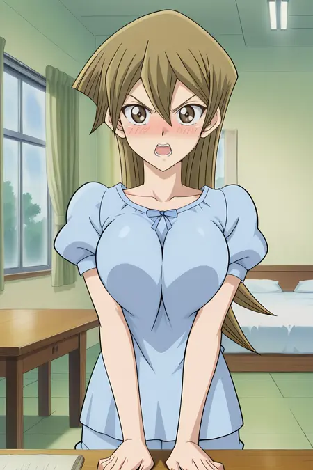 Asuka Tenjouin, 1girl, solo, blonde hair, brown eyes, long hair, hair between eyes, bangs, medium large breasts,