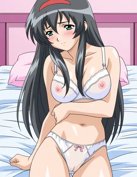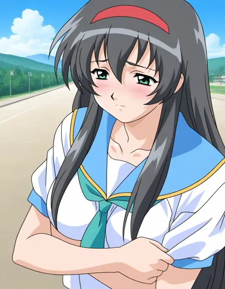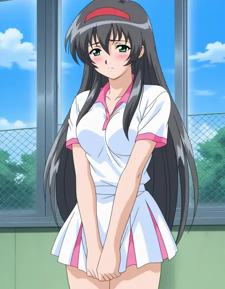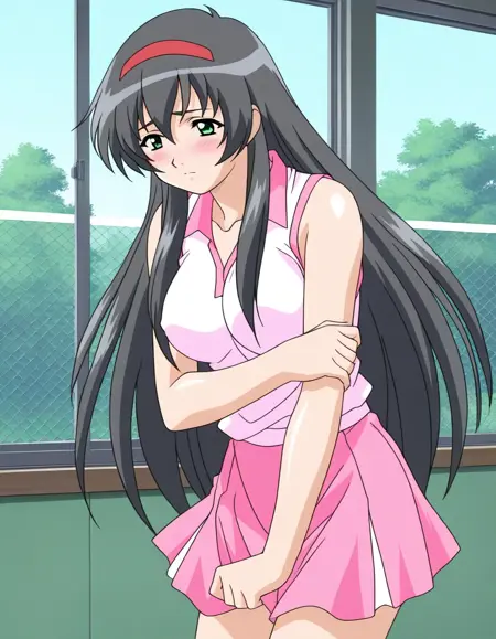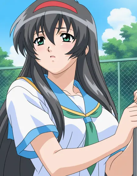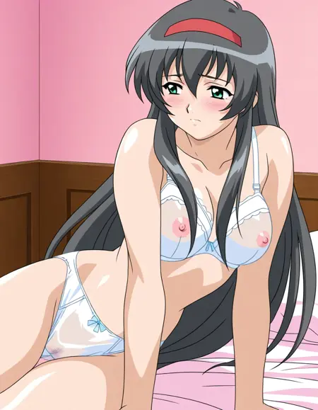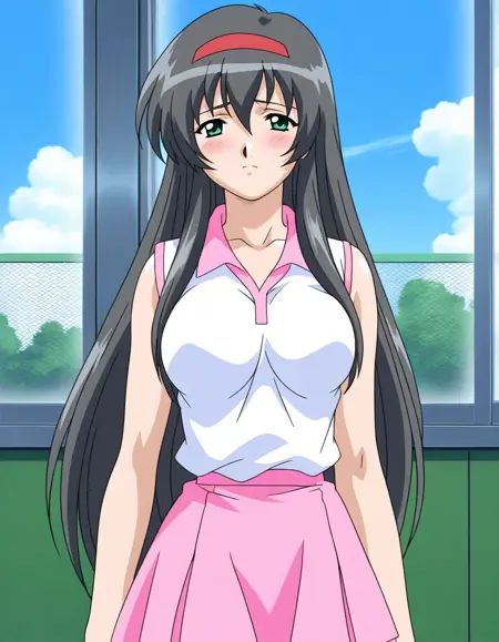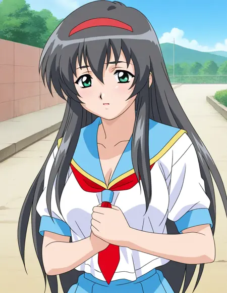 Himeno_Yuuri_OVA, 1girl,solo, black hair, long hair, green eyes, red hairband, large breasts, bangs, sidelocks, hair between eyes, 2010s (style), anime coloring,