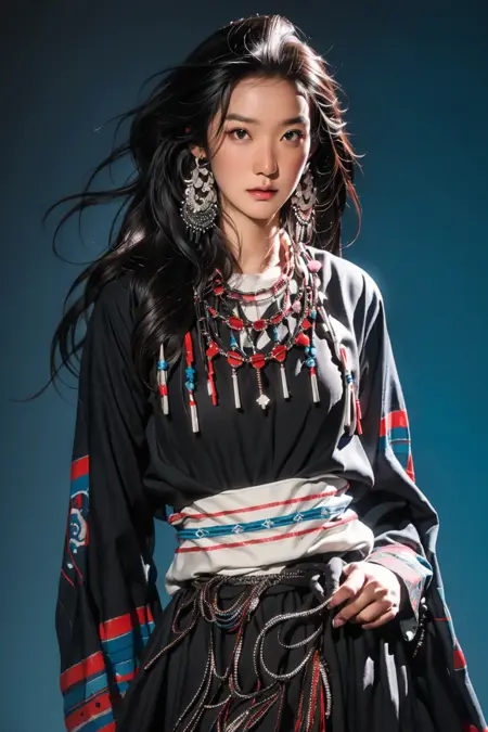 このモデルは中国のチベット族の衣装をインスピレーションとしており、草原の風景や牛(ヤク)や羊のような生物との組み合わせで非常に良い効果を発揮します。衣装にはチベット風の模様や耳飾り、ネックレスが含まれています。「fur hat」と入力すると、柔らかい毛皮の帽子を付けることができます。モデル内のチベット族衣装に誤った特徴が含まれている可能性がある場合、ご指摘やご提案をお待ちしております。チベット族衣装の特徴をより正確に再現するためのご協力をお願いします。