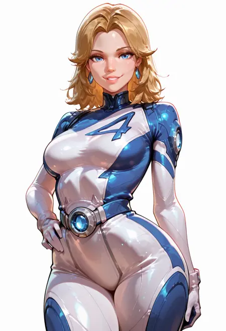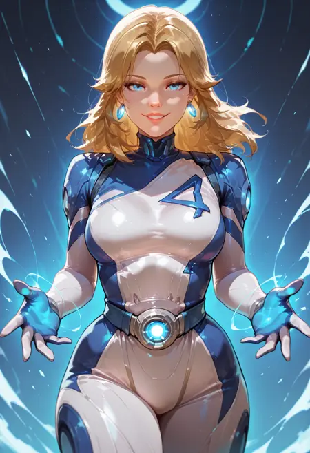 sue_storm, 1girl, solo, breasts, bodysuit, jewelry, belt, medium breasts, smile, glowing, lips, long hair, open hands, parted lips