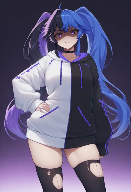 Ks0nGth, 长发, 双马尾, 多色发, 分色发, 蓝发, 黑发, 紫发, 黑色项圈, 双色连帽衫, 白色连帽衫, 黑色连帽衫, 袖子过腕, 黑色及膝长筒袜, 破损长筒袜