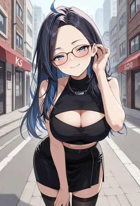 Ks0nMdl, 黑发, 染发, 蓝发, 蓝眼, 长发, 流海, 额头, 天线发, 眼镜, 项链, 黑色短上衣, 吊带, 无袖, 胸部露空, 黑色短裙, 黑色及膝长筒袜