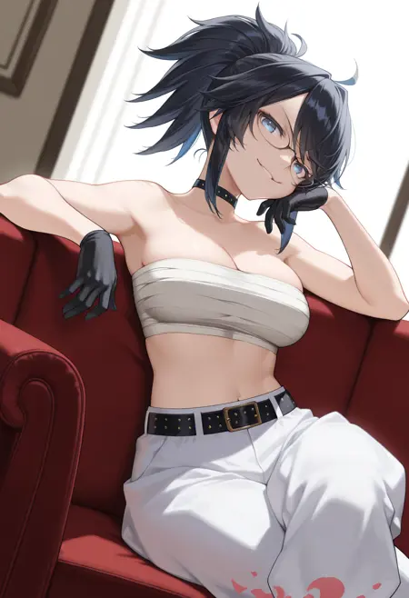 Ks0nBase, 黑发, 蓝眼, 马尾, 眼镜, 黑色项圈, 白色胸裹布, 露腹, 胸部露出, 腰带, 白色裤子, 蓬松裤, 黑色手套, 裸露手臂