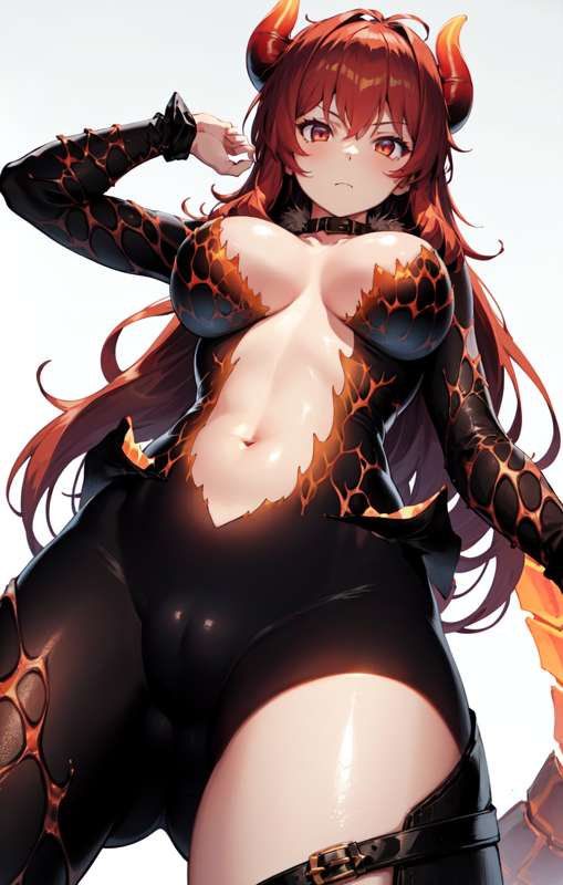 black_collar, center_opening, cleavage, collarbone, leg_belt, navel,red_eyes, red_hair,long_hair, dragon_girl, dragon_horns, dragon_tail, large_breasts,