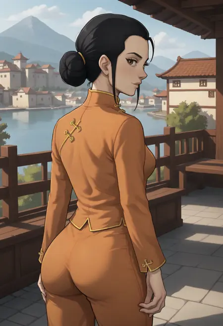 推荐标签:1girl,solo,棕色眼睛,黑发,发髻,单发髻,胸部,中等胸部,中式服装,裤子,橙色上衣