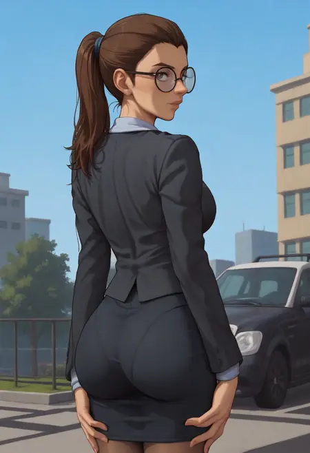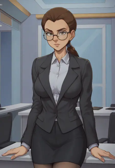 recommended tags: 1girl, solo, brown eyes, brown hair, long hair, ponytail, breasts, large breasts, formal, suit, shirt, jacket, skirt, black skirt, pencil skirt, pantyhose, glasses, round eyewear,