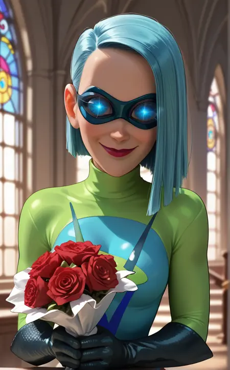 MainOutfit_Voyd_ownwaifu, 1girl, aqua hair, green eyes, asymmetrical hair, blue hair, hair over one eye, domino mask, elbow gloves, eye mask, blue bodysuit, green bodysuit, green gloves, green legwear, green mask, logo, medium hair, superhero, superhero costume, two-tone bodysuit, lipstick, makeup, red lips, medium breasts, skin tight, turtleneck, multicolored bodysuit, nose, thick thighs, yellow skin, 3d,