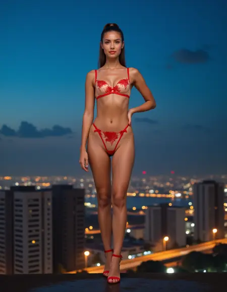 프롬프트에는 다음을 포함해야 합니다: outfit0019, 섬세한 레이스 소재로 만든 화려한 플로럴 패턴의 빨간 란제리 세트를 착용한