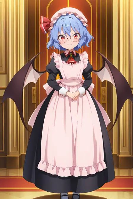 remilia scarlet, 1girl, solo, red eyes, blue hair, short hair, wings, bat wings, remilia scarlet \(maid mistress\), alternate costume, maid headdress, mob cap, round eyewear, semi-rimless eyewear, black dress, enmaided, juliet sleeves, puffy sleeves, long sleeves, maid apron, frilled apron, waist apron, white apron, red ascot, black footwear,