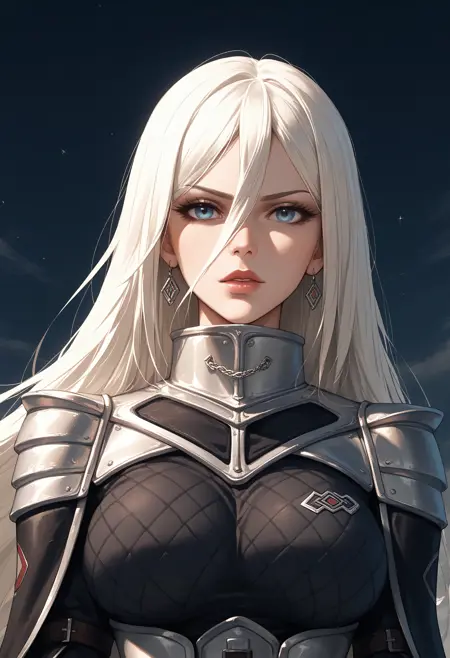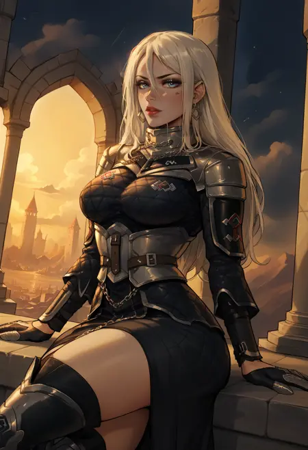 推荐标签:1girl,独照,蓝眼睛,白发,长发,头发遮眼,胸部,大胸部,嘴唇,妆容,眼影,口红,睫毛膏,眼线,耳环,珠宝,链条,盔甲,肩甲,盔甲连衣裙,胸甲,黑色手套,手套,护肩,过膝袜,靴子,高筒靴,高跟靴