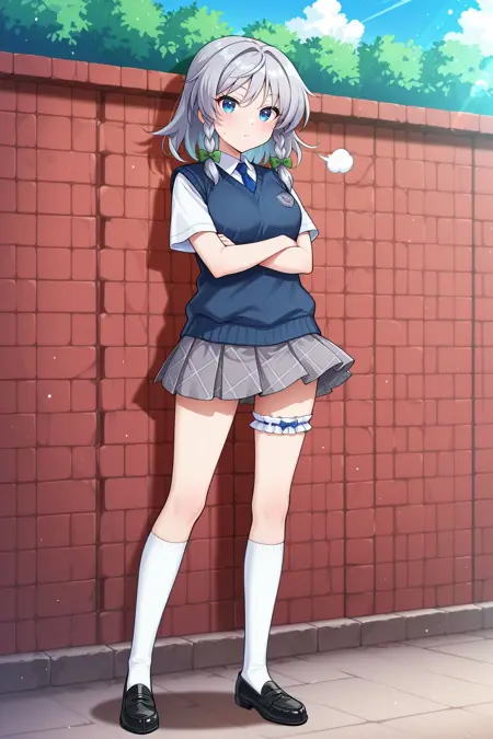 izayoi sakuya, 1girl, solo, blue eyes, grey hair, medium hair, loose hair strand, twin braids, side braids,, izayoi sakuya \(elegant scarlet devil student council member\), アルターネイトコスチューム、髪飾り、緑のリボン、青いセーター、セーターベスト、青いネクタイ、白いシャツ、襟付きシャツ、短い袖、緑の腕輪、灰色のスカート、チェック柄スカート、プリーツスカート、フリル付き太ももストラップ、白い靴下、膝丈靴下、黒い靴、ローファー、