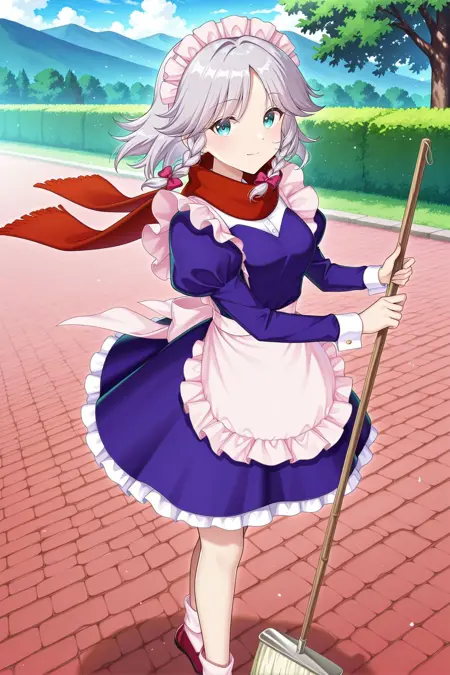 izayoi sakuya, 1girl, solo, aqua eyes, grey hair, side swept bangs, hair intakes,, izayoi sakuya \(cherry-blossom-illusion\), アルターネイトコスチューム、メイド頭飾り、薄いピンクの頭飾り、赤いスカーフ、薄いピンクのエプロン、ウェストエプロン、ジュリエット袖、長い袖、薄いピンクの靴下、赤い靴、ほうきを手に持つ、